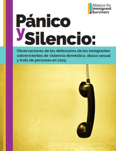 El año pasado, la Alianza para Sobrevivientes Inmigrantes (AIS) publicó un resumen de los resultados principales de una encuesta nacional de defensores y abogades que realizamos, seguido de un informe original, Pánico y Silencio: Observaciones de les defensores de les inmigrantes sobrevivientes de violencia doméstica, abuso sexual y trata de personas en 2025. Hoy, publicamos una versión en español de ambos recursos, que ofrecen más información sobre lo que les defensores están reportando y siendo testigos mientras trabajan con les sobrevivientes inmigrantes de violencia doméstica, agresión sexual y trata de personas.